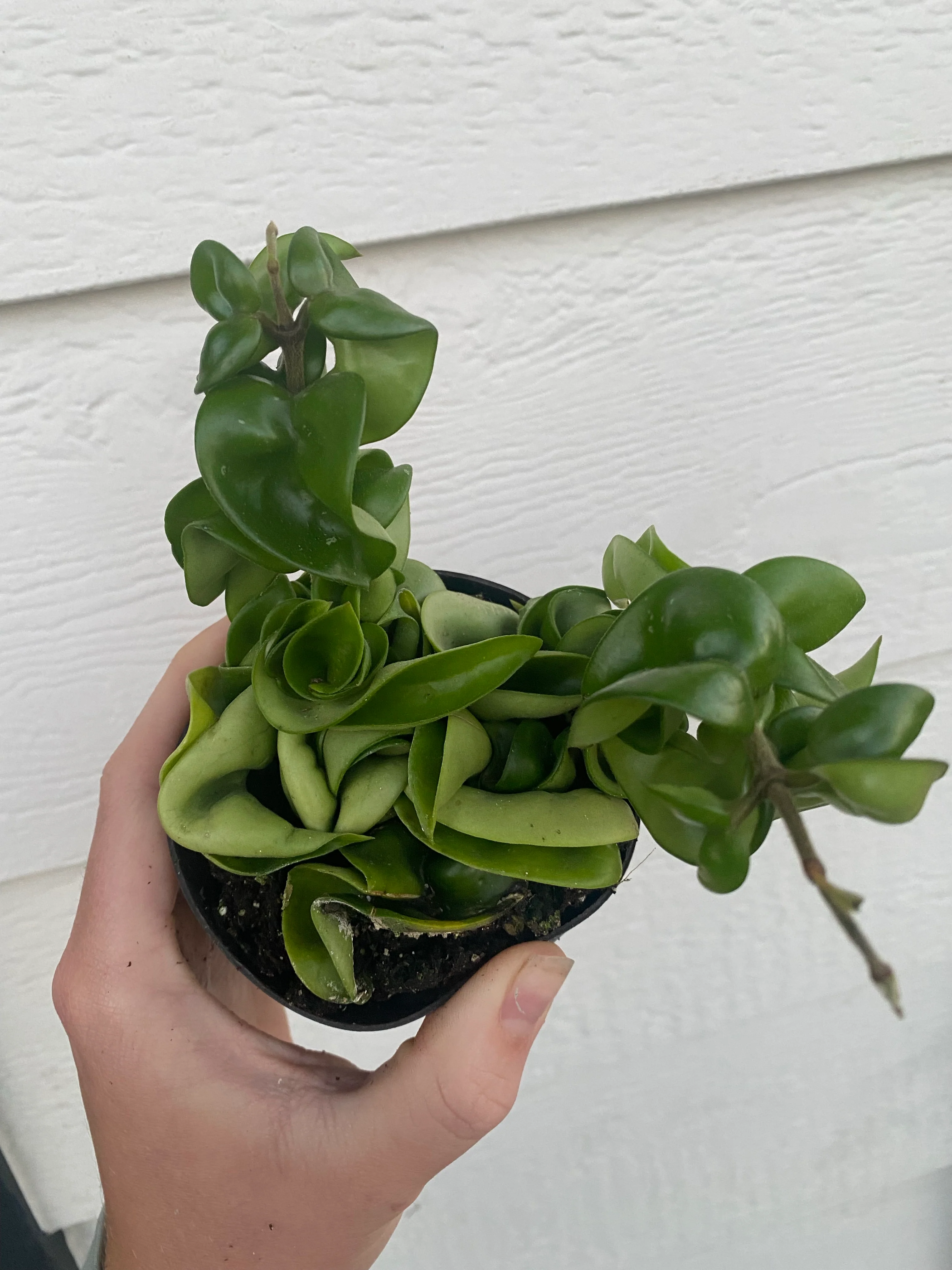 Hoya plants are the perfect gateway plant from succulents into houseplants! Hoyas have thick and waxy leaves, meaning they have similar care to succulents. Hoyas are known for their fragrant blooms, but also vibrant leaves. Hoyas thrive in bright, indirect light. They can be kept inside year-round, or outside when temps are above 40/45 degrees at the coldest part of the night. To care for these plants, water when the soil is dry. Humidifiers and grow lights work great with hoyas, but are not a requirement. The brighter the indirect light is, the more colorful and sun-stressed your hoya's leaves will be!