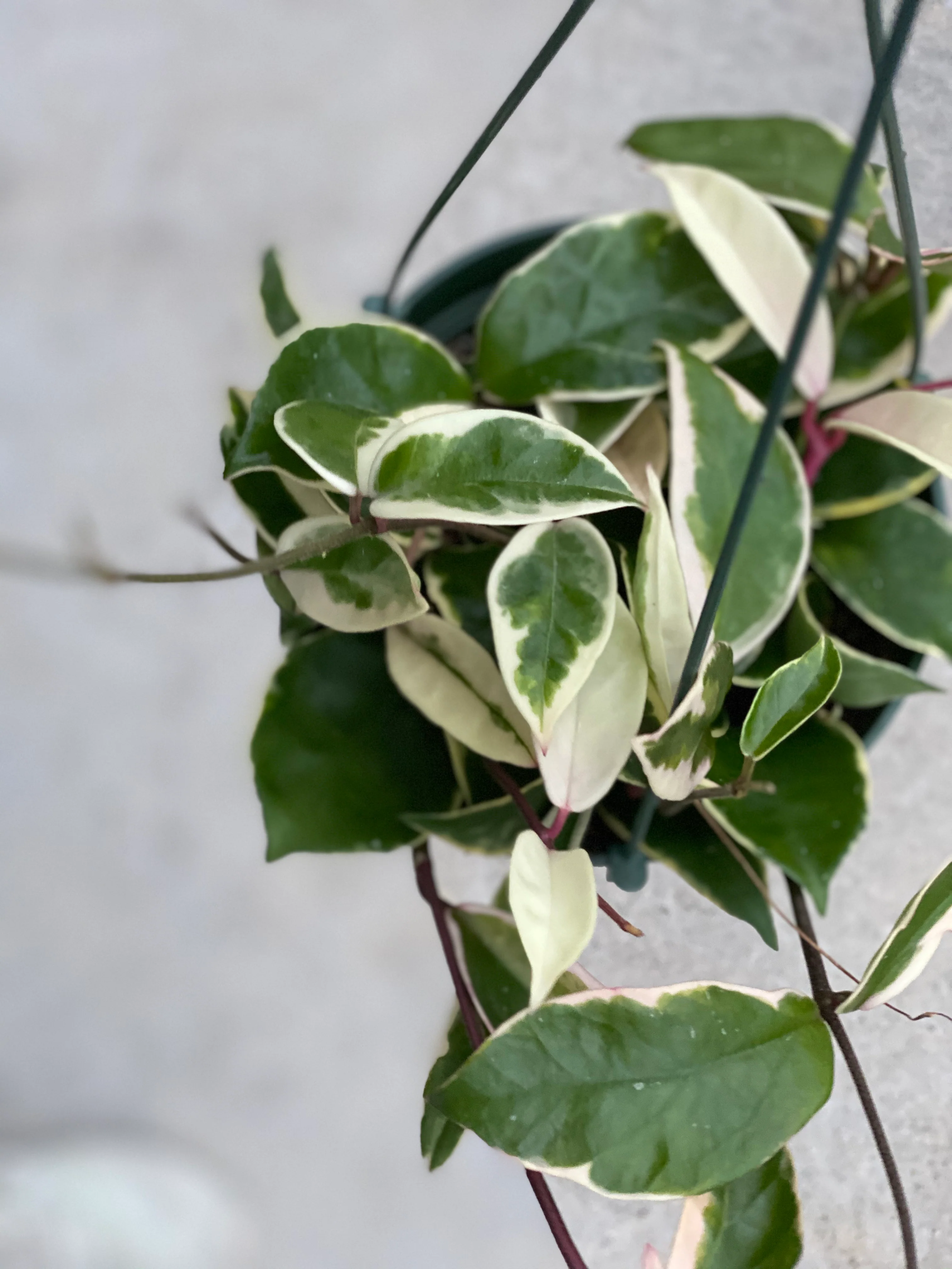 Hoya plants are the perfect gateway plant from succulents into houseplants! Hoyas have thick and waxy leaves, meaning they have similar care to succulents. Hoyas are known for their fragrant blooms, but also vibrant leaves. Hoyas thrive in bright, indirect light. They can be kept inside year-round, or outside when temps are above 40/45 degrees at the coldest part of the night. To care for these plants, water when the soil is dry. Humidifiers and grow lights work great with hoyas, but are not a requirement. The brighter the indirect light is, the more colorful and sun-stressed your hoya's leaves will be!