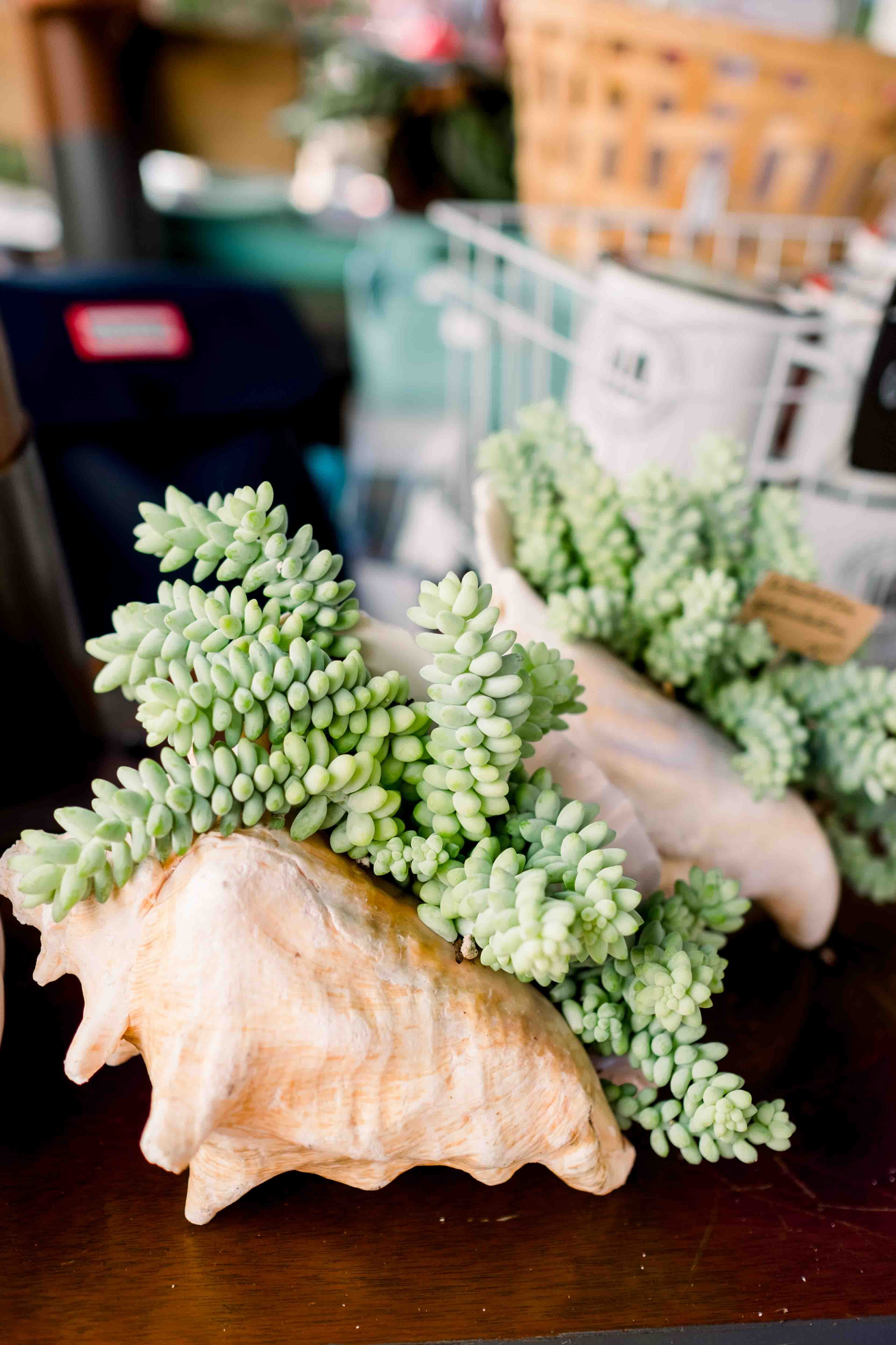In this botanical project, the succulents live inside of the conch shell in a small amount of soil. The succulents will thrive and grow in the shell with a simple water mist 1x a week.